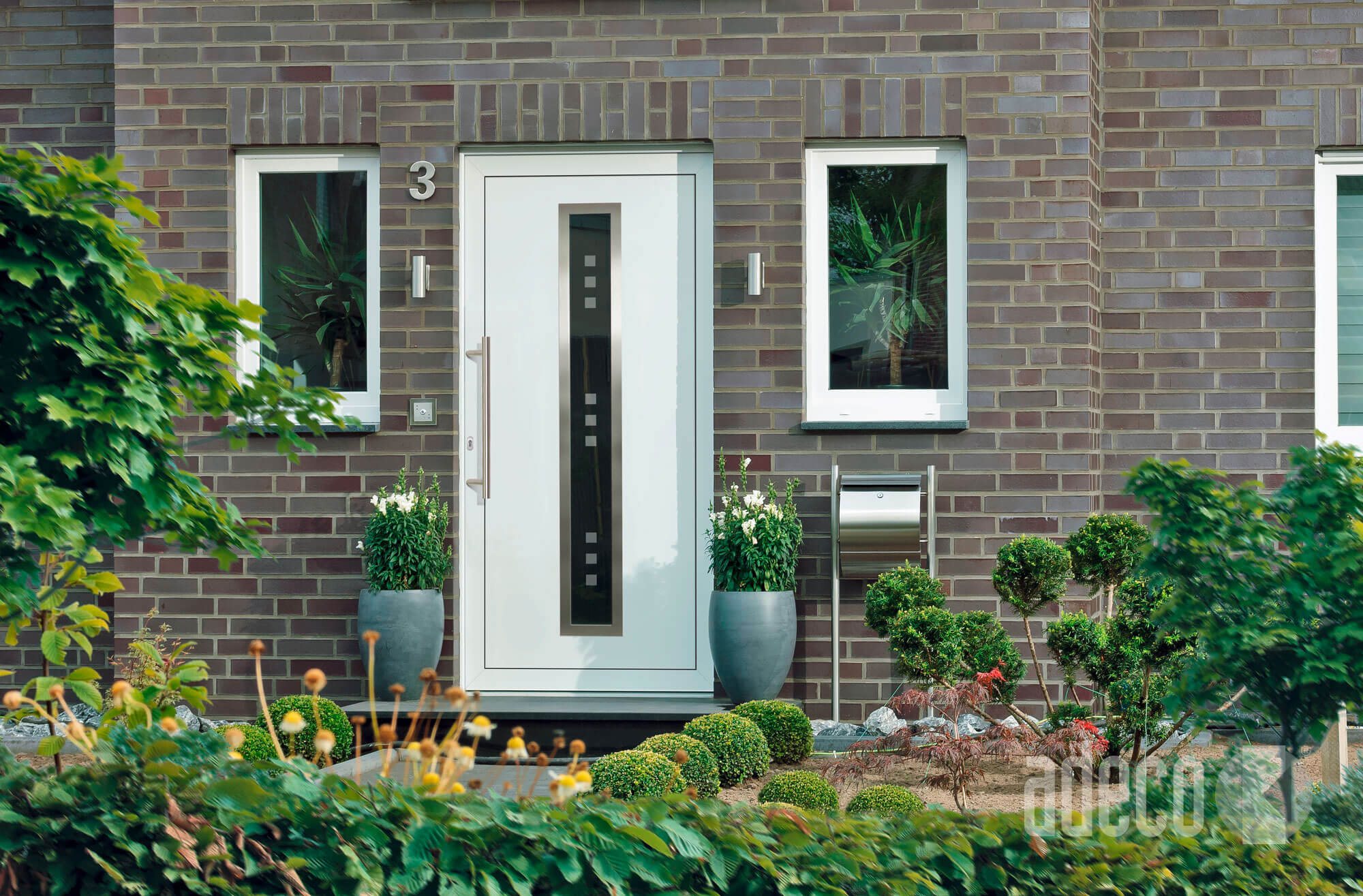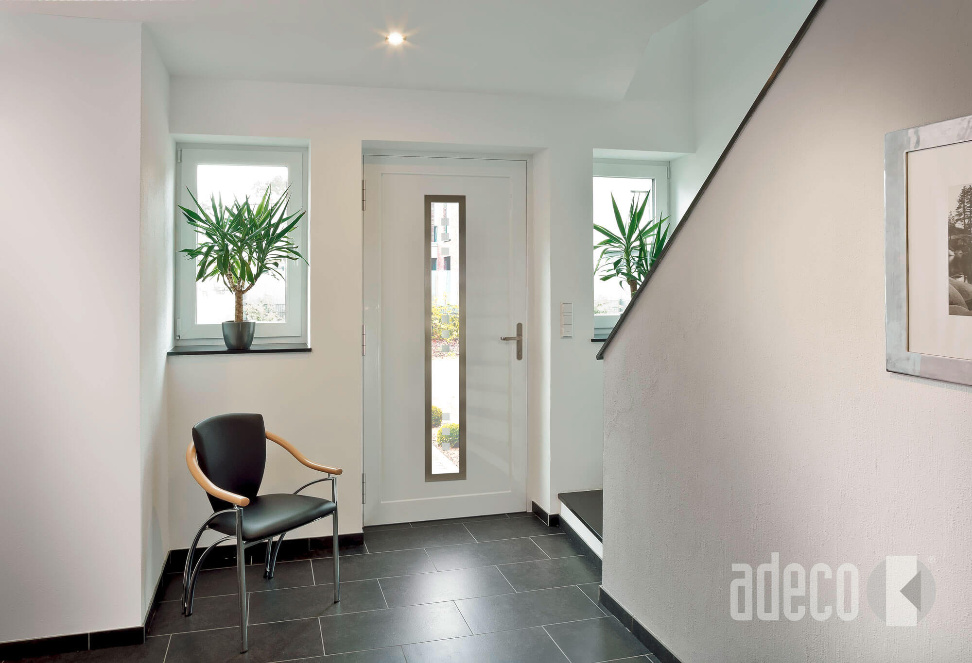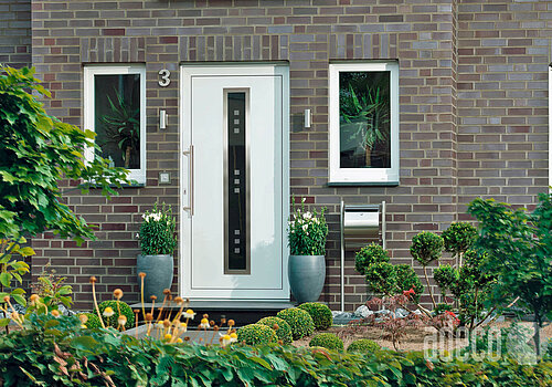 Detail: verglast, in Ausführung Einsatzfüllung, Sandstrahlung Indura 1, auf Grundglas Klarglas, Fläche klar – Quadrate matt, Griff HA 622, Edelstahl matt gebürstet