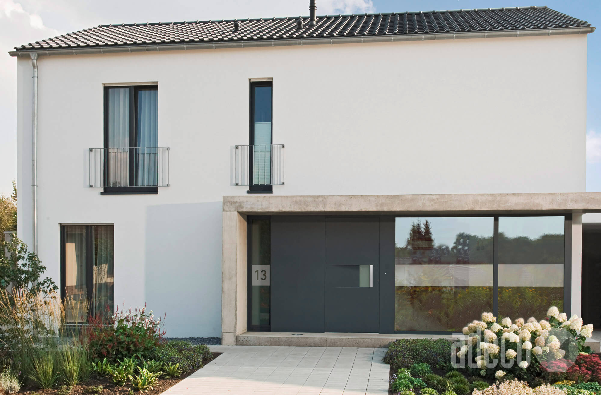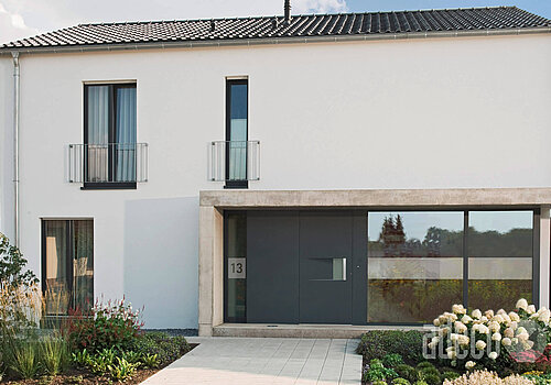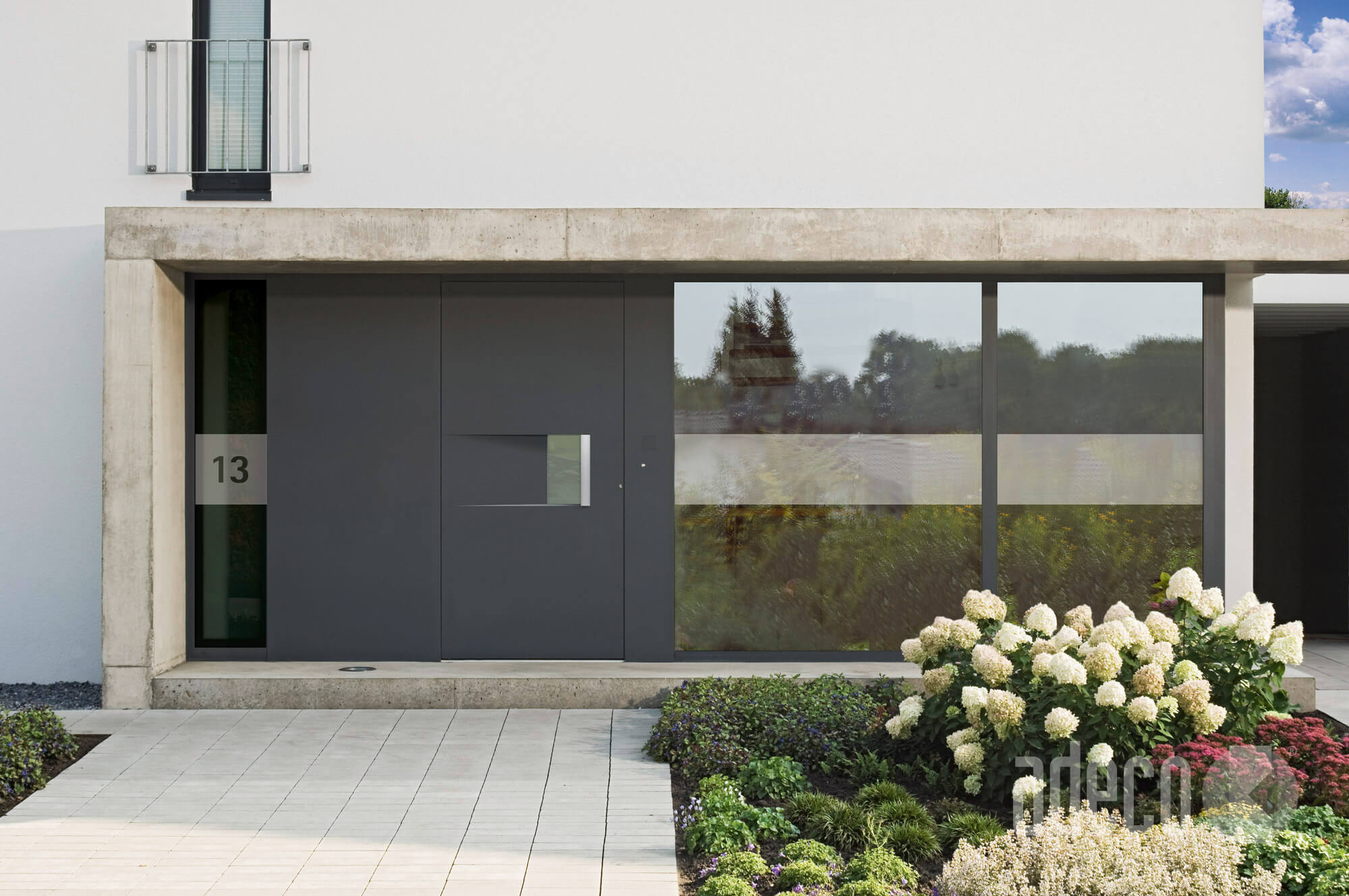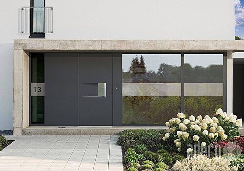 Details: rechts verglast, Farbvariante Finea 105, Sandstrahlung vollflächig auf Grundglas Klarglas, mit innenliegender Griffmulde und zusätzlichem Griff HA 395, Aluminium silber eloxiert, mit Seitenteilverglasung, Sila | Modellscheibe, Sandstrahlung Sila 1, auf Grundglas Klarglas Flächen + Hausnummer klar – Hintergrund matt, und 2 Seitenteilverglasungen, Sila | Modellscheiben, Sandstrahlung Sila 3 auf Grundglas Klarglas, Flächen klar – 1 waagerechter Streifen matt