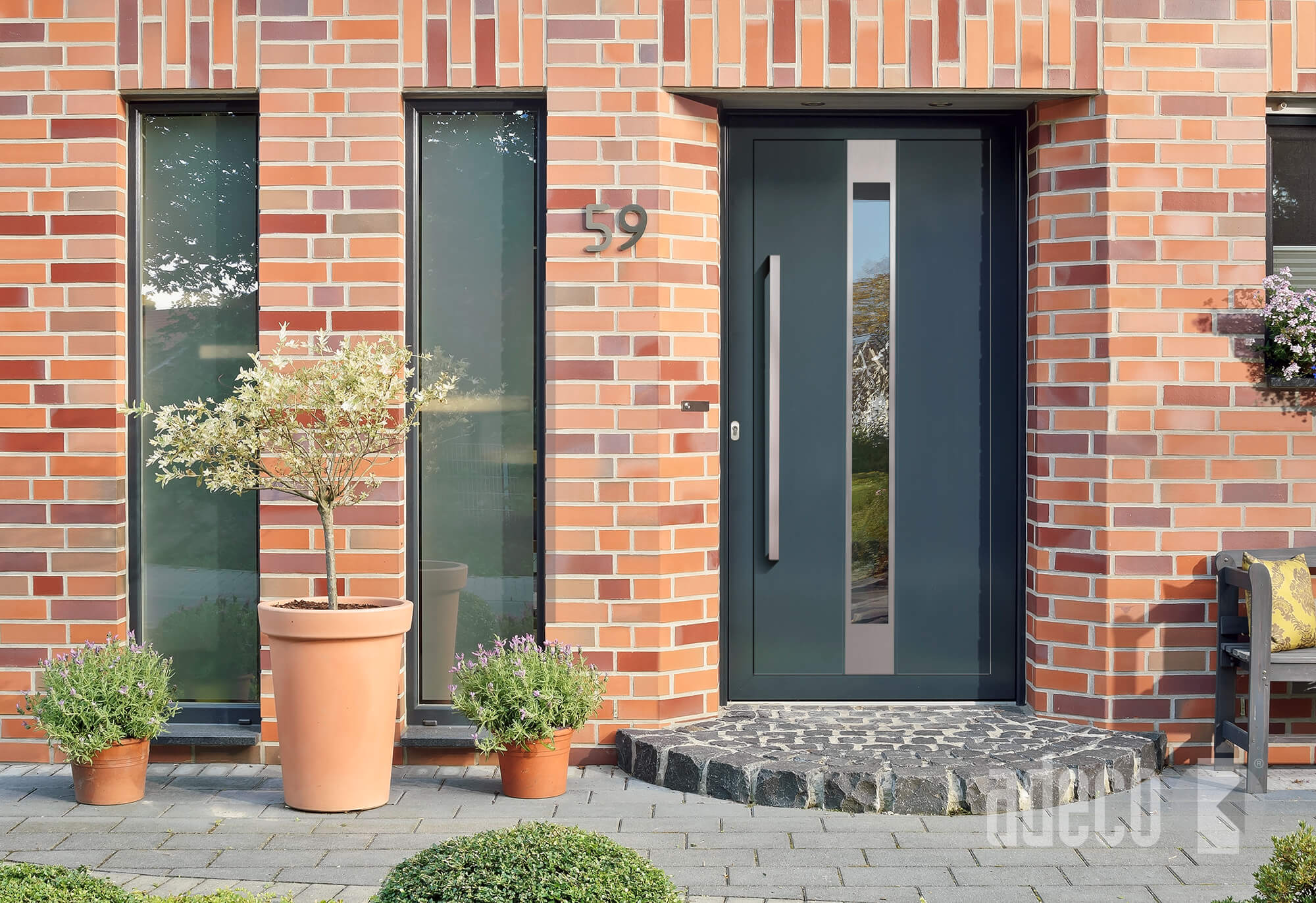 Details: verglast, in Ausführung Einsatzfüllung, Dekor Schiefergrau, Klarglas plan, mit integriertem Griff HA 312, Edelstahl matt gebürstet