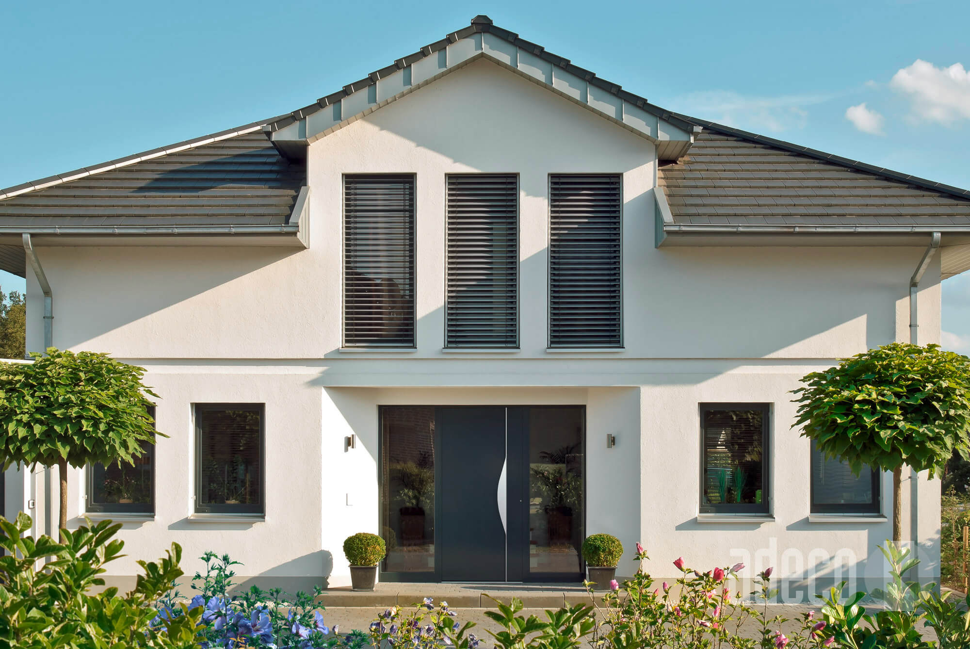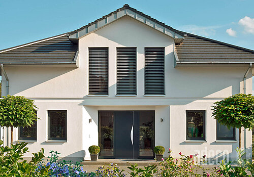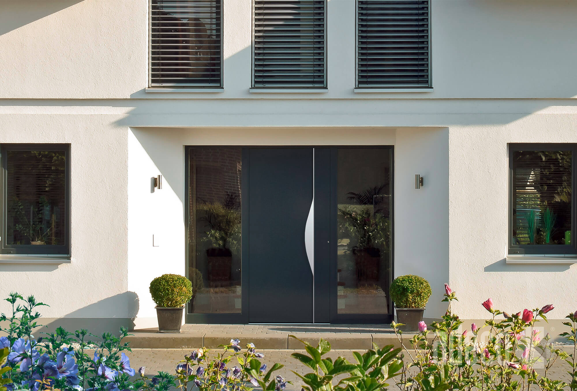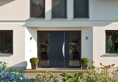 Details: geschlossen, Farbvariante Finea 13, mit integriertem Griff HA 398, Aluminium Finea 300 beschichtet, mit 2 Seitenteilverglasungen, Klarglas plan