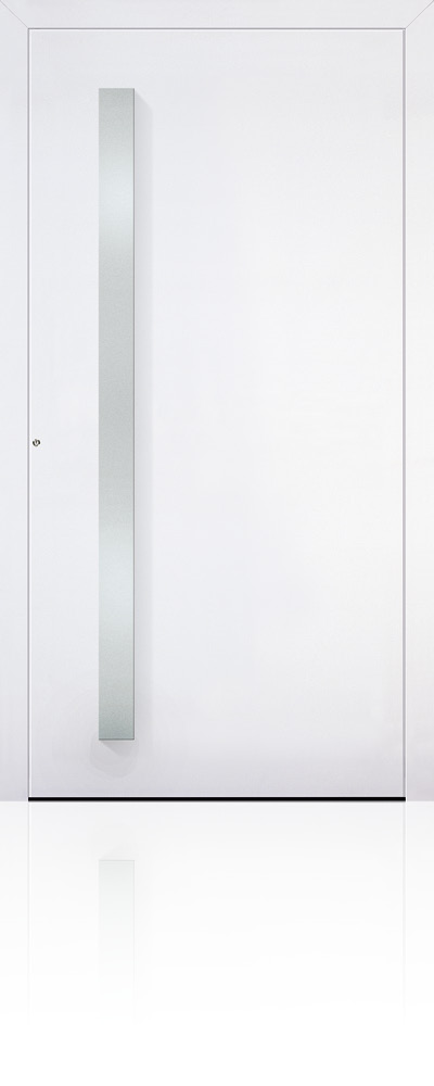 Here, entrance door handle, structural form and colour determine the visual impact of the entrance door panel. This solution also lends itself to segmented porches and exaggerated heights. The viewer is not distracted by anything, but is focussed only on the entrance door leaf with handle. It is functional and ergonomically shaped. Glazed sidelights bring light and brightness into the hallway. And there is no skimping on security. Closed attachment door panels on both sides provide maximum protection against burglary thanks to an exterior 3 mm and interior 2 mm thick aluminium protective layer.