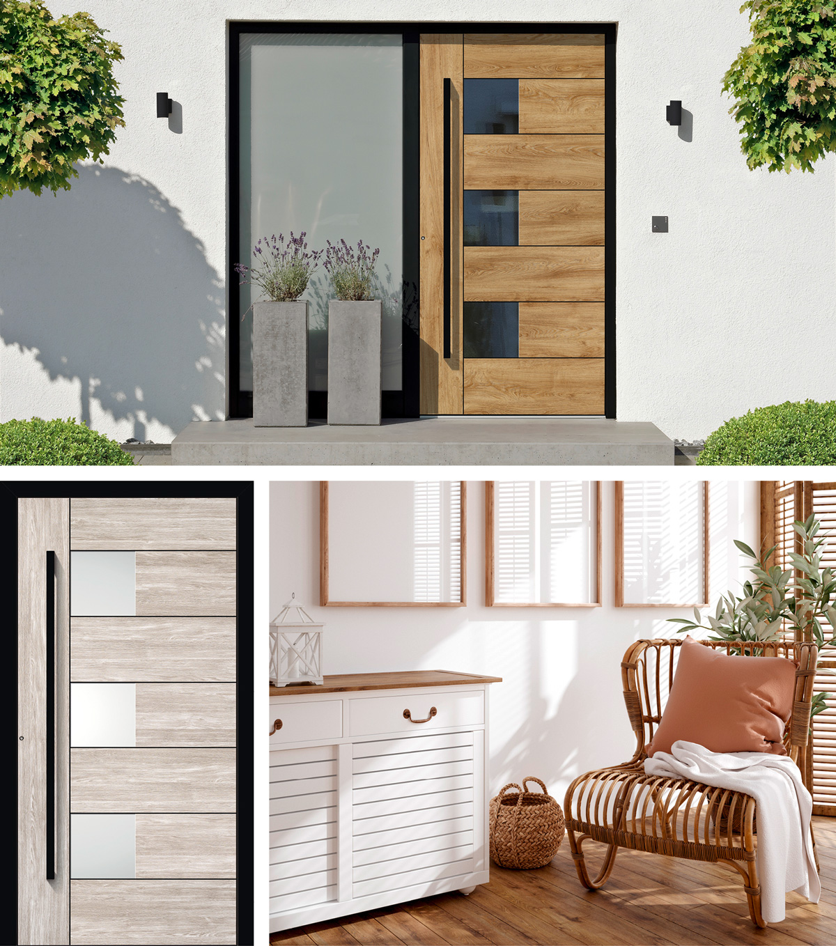 If you are aiming for a cosier look, you can combine black design details with a natural wood decor. The adeco design foils are very similar to real wood in terms of look and feel, and transform your entrance into a pleasant, welcoming area. Choose from four modern wood shades – malt, nature, concrete and alpine. With the models Metris glazed, Metris closed, Alliso and Caverro, it is possible to combine vertical and horizontal foiling (adeco design foiling, ad). This way, the grain follows the design of the door, for example the horizontal inlays.