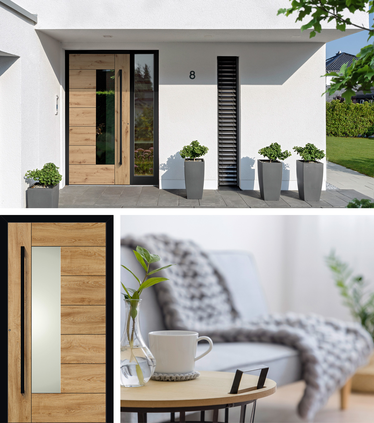 If you are aiming for a cosier look, you can combine black design details with a natural wood decor. The adeco design foils are very similar to real wood in terms of look and feel, and transform your entrance into a pleasant, welcoming area. Choose from four modern wood shades – malt, nature, concrete and alpine. With the models Metris glazed, Metris closed, Alliso and Caverro, it is possible to combine vertical and horizontal foiling (adeco design foiling, ad). This way, the grain follows the design of the door, for example the horizontal inlays.