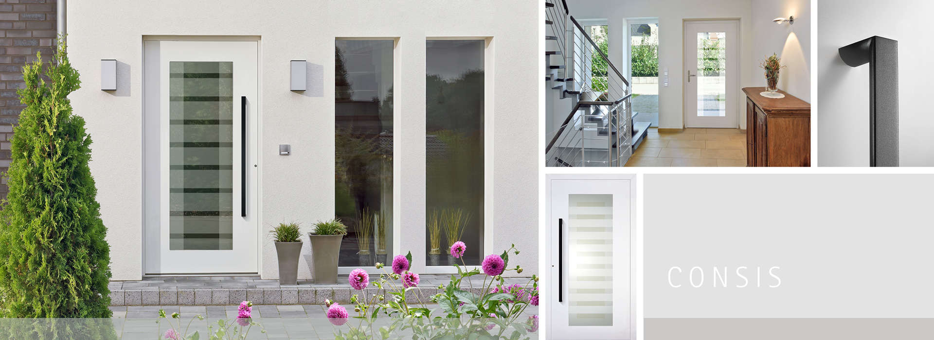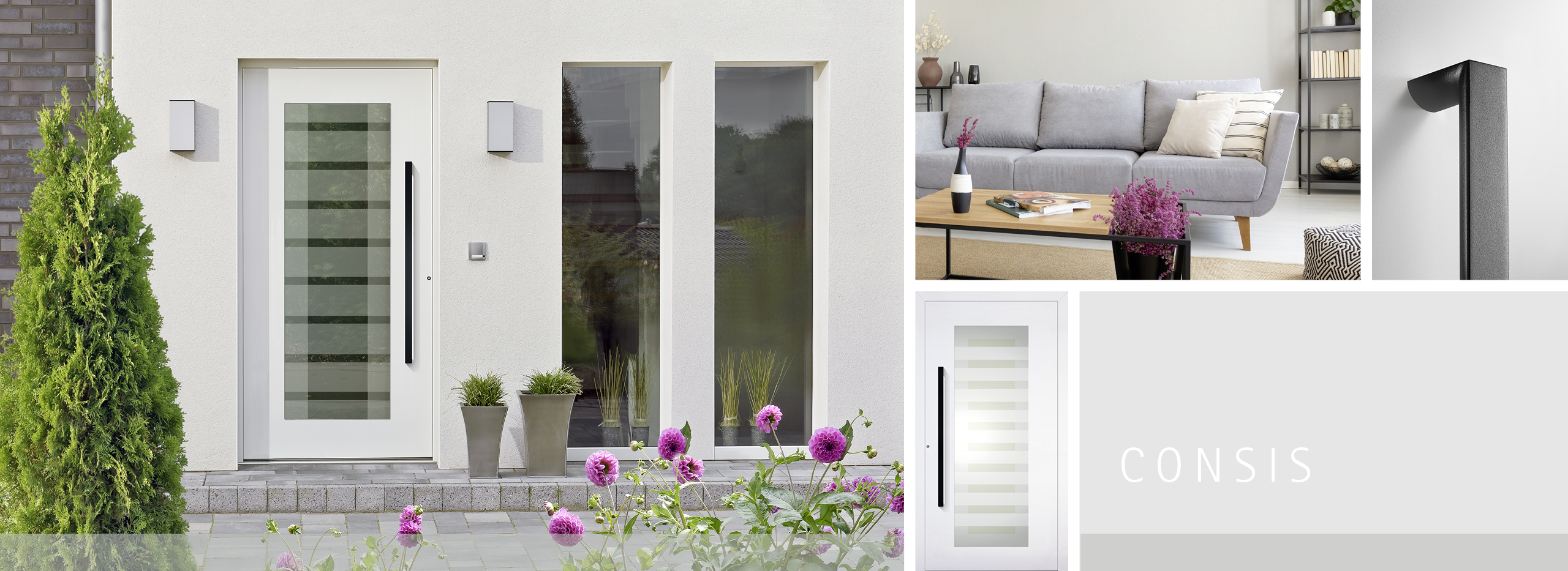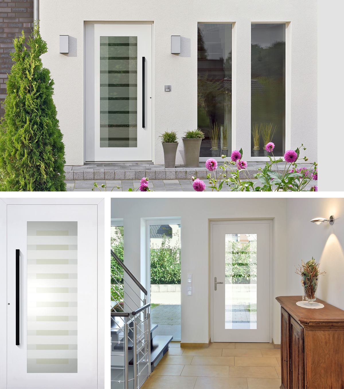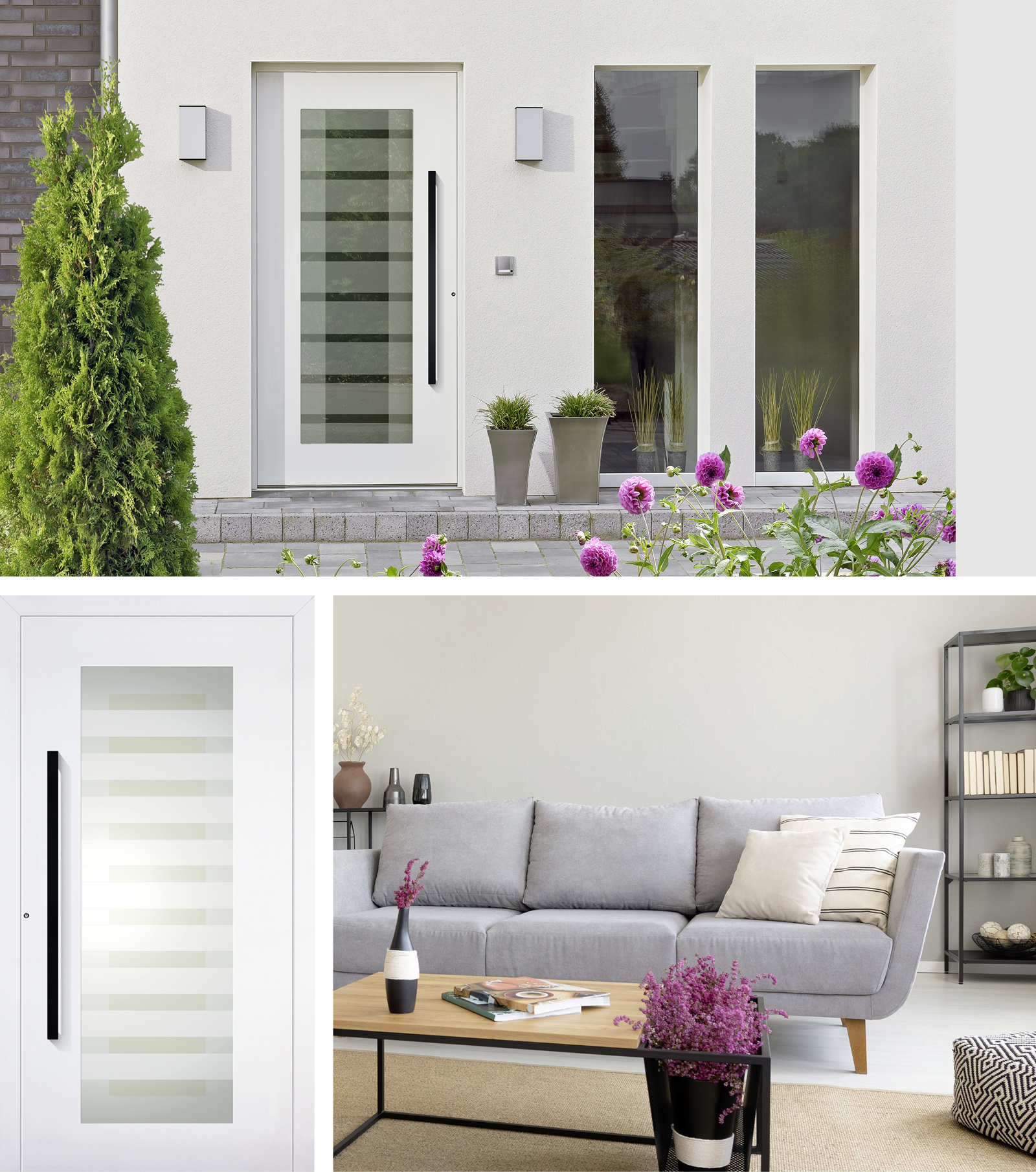 Si vous la préférez moderne, choisissez une couleur de base intemporelle qui s'harmonise avec les fenêtres ou l'environnement. Chaque modèle de porte peut être conçu individuellement dans une large gamme d'options de combinaison et donne à votre maison son propre charme.