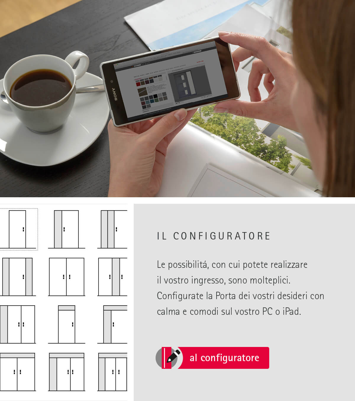 Visitate ora il nostro configuratore di porte d‘ingresso e scoprite i nuovi highlight! Le superfici di design appena introdotte in look corten e cemento sono ora disponibili per la selezione. Lasciatevi ispirare dalla nuova categoria "Design Highlights", che mostra selezionati varianti di modelli. La vetrata decorativa di tendenza "Zoe" è ora disponibile anche per il modello "Consis Export". I sommari dal design vivace rendono la configurazione un'esperienza. Create adesso la porta d‘ingresso dei vostri sogni: Configuratore di porte d'ingresso