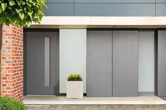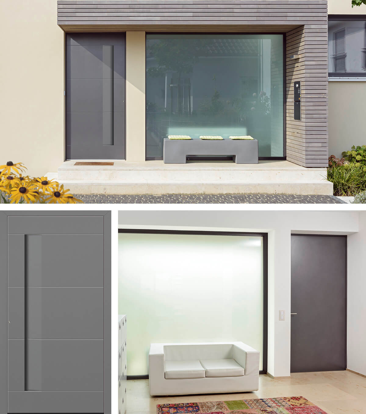 Maniglione, Forma e Colore danno qui da soli l`impatto ottico del Pannello Porta. Questa soluzione si presta anche per Porte ingresso a piú ante e altezze fuori standard . L´occhio dell`ossevatore non viene distratto da niente e si concentra sul Pannello e sul maniglione. Esso é di forma funzionale ed ergonomica . Pannelli laterali vetrati danno luce e chiarore nell´entrata. Anche la sicurezza non passa in secondo piano. Portoncini chiusi e applicati su 2 facciate danno la massima tutela contro effrazioni grazie a uno spessore della lamiera di alluminio esterna di 3 mm e interna di 2 mm.