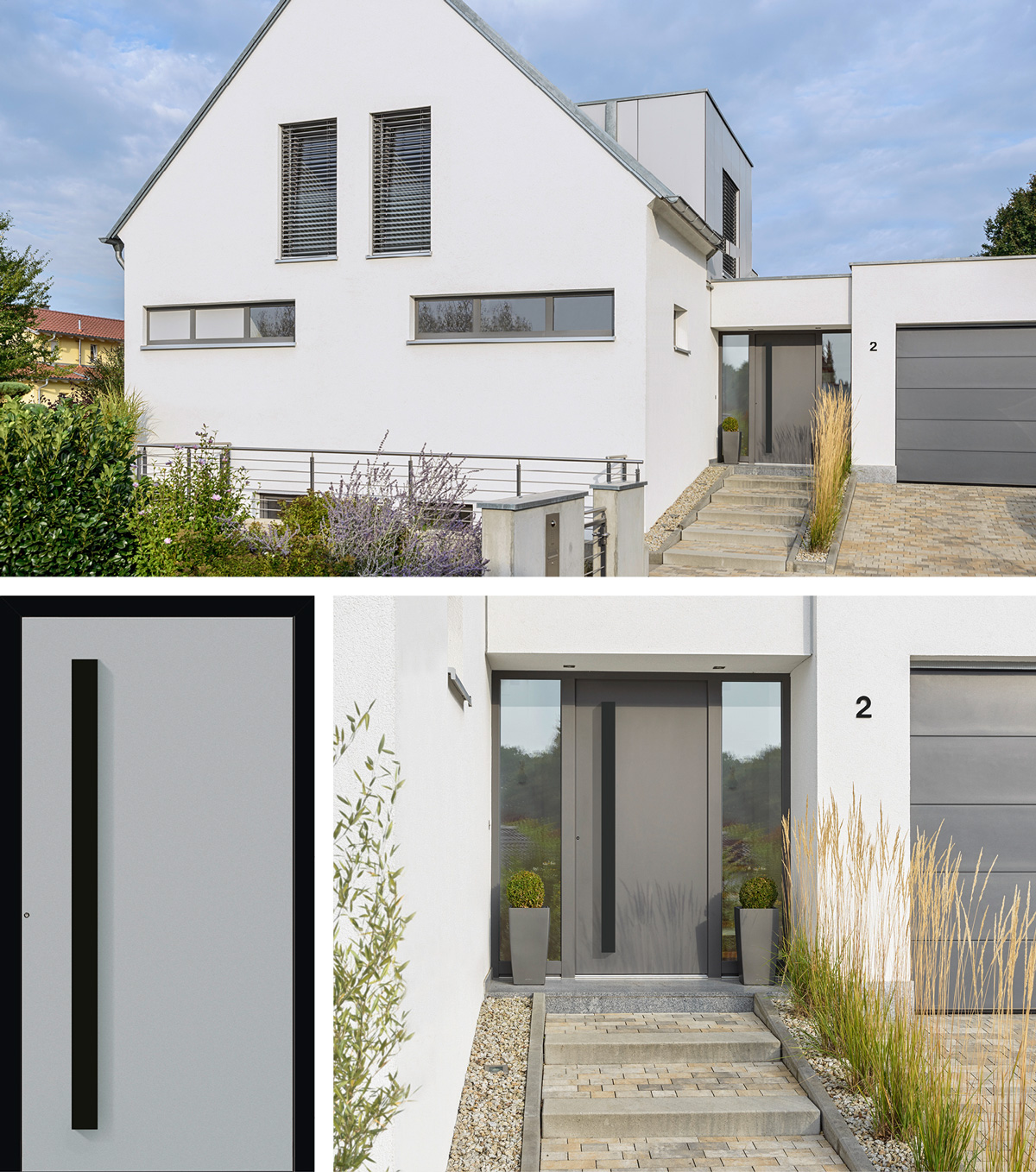 Se preferite un look moderno, scegliete un colore di base senza tempo che si abbini alle finestre o all'ambiente circostante. Ogni singolo modello di porta può essere progettato individualmente in un'ampia gamma di combinazioni e conferisce alla vostra casa il suo fascino.