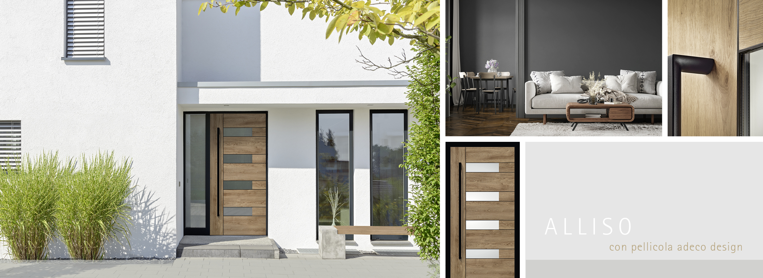 Vi piace l'intimità? Abbinate poi i dettagli neri a un arredamento in legno naturale. Le pellicole di design adeco hanno l'aspetto e la sensazione del vero legno e danno all'ingresso un'impressione invitante e accogliente. Scegliete tra le quattro tonalità del legno invitanti: malto, natura, cemento e alpino. Con i modelli Metris vetrata, Metris chiusa, Alliso e Caverro è possibile combinare la pellicola verticale e orizzontale (pellicola adeco design – ad). In questo caso, le venature seguono il design dell'anta, ad esempio gli intarsi orizzontali.