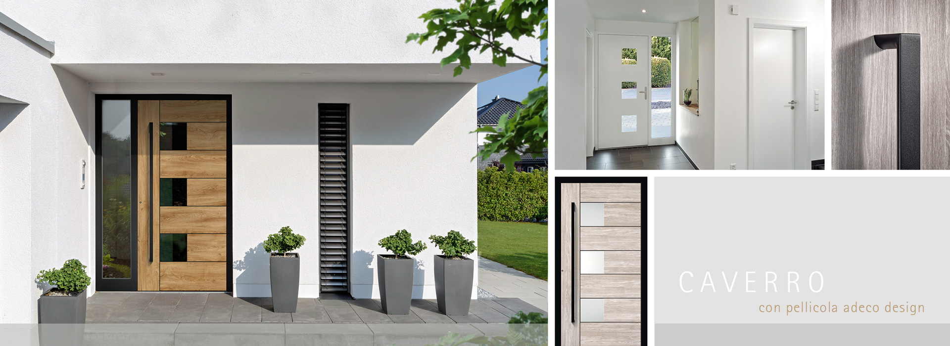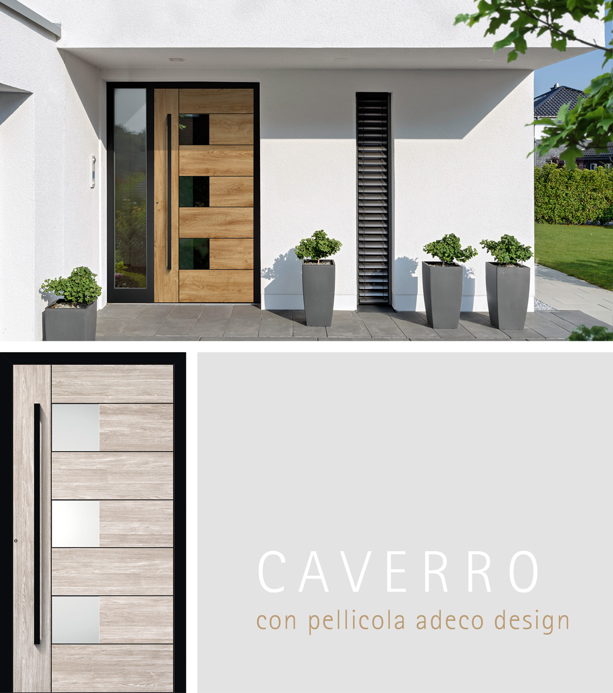 Vi piace l'intimità? Abbinate poi i dettagli neri a un arredamento in legno naturale. Le pellicole di design adeco hanno l'aspetto e la sensazione del vero legno e danno all'ingresso un'impressione invitante e accogliente. Scegliete tra le quattro tonalità del legno invitanti: malto, natura, cemento e alpino. Con i modelli Metris vetrata, Metris chiusa, Alliso e Caverro è possibile combinare la pellicola verticale e orizzontale (pellicola adeco design – ad). In questo caso, le venature seguono il design dell'anta, ad esempio gli intarsi orizzontali.
