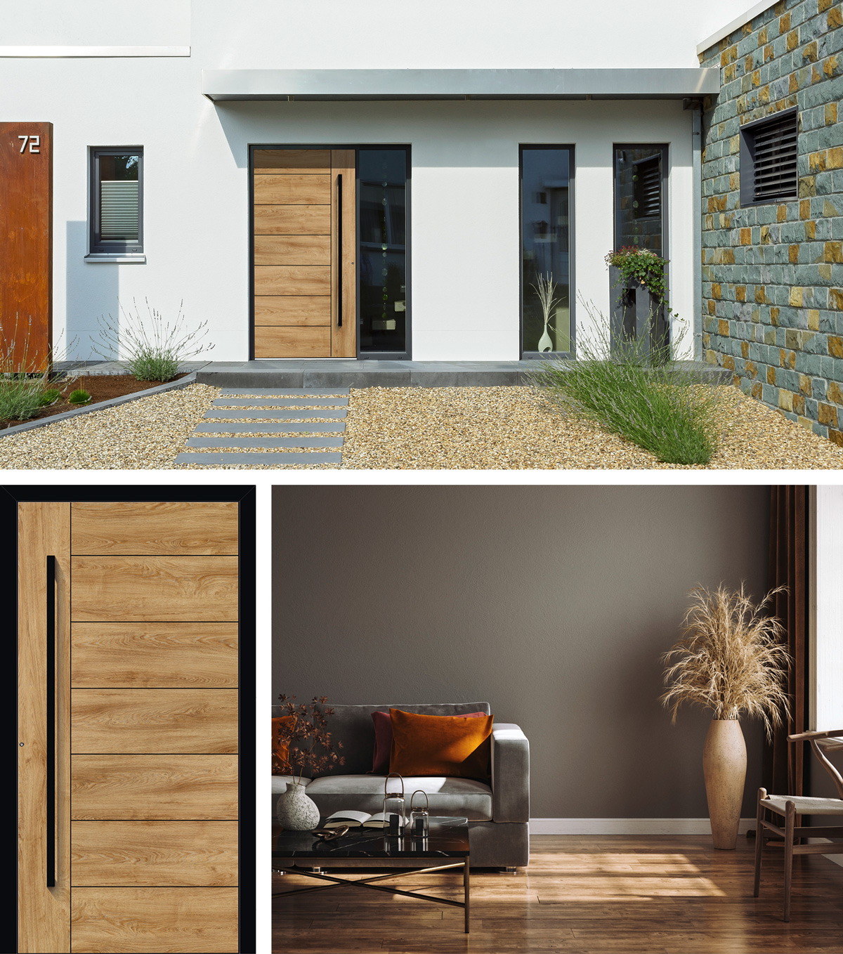 Vi piace l'intimità? Abbinate poi i dettagli neri a un arredamento in legno naturale. Le pellicole di design adeco hanno l'aspetto e la sensazione del vero legno e danno all'ingresso un'impressione invitante e accogliente. Scegliete tra le quattro tonalità del legno invitanti: malto, natura, cemento e alpino. Con i modelli Metris vetrata, Metris chiusa, Alliso e Caverro è possibile combinare la pellicola verticale e orizzontale (pellicola adeco design – ad). In questo caso, le venature seguono il design dell'anta, ad esempio gli intarsi orizzontali.