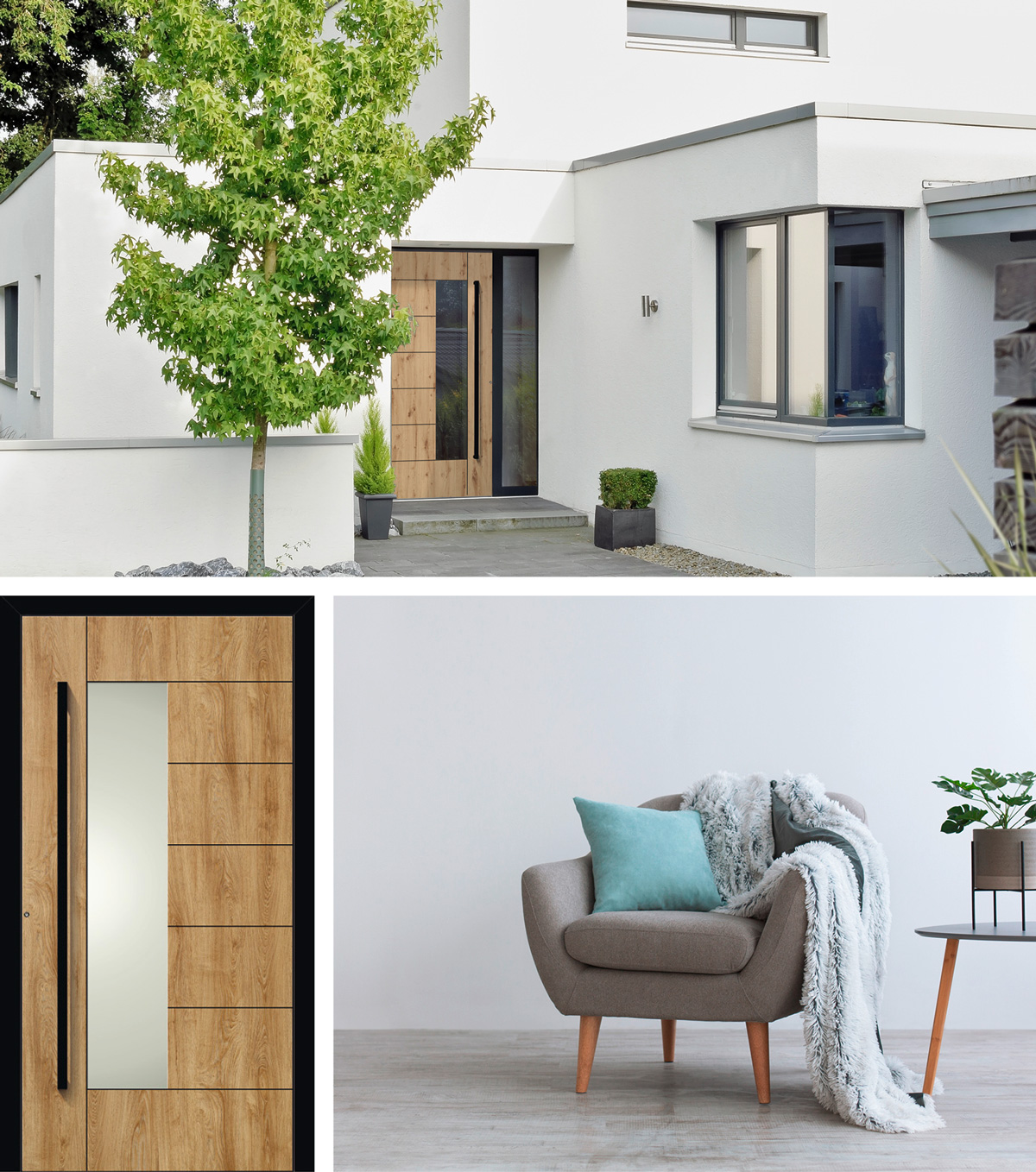 Vi piace l'intimità? Abbinate poi i dettagli neri a un arredamento in legno naturale. Le pellicole di design adeco hanno l'aspetto e la sensazione del vero legno e danno all'ingresso un'impressione invitante e accogliente. Scegliete tra le quattro tonalità del legno invitanti: malto, natura, cemento e alpino.