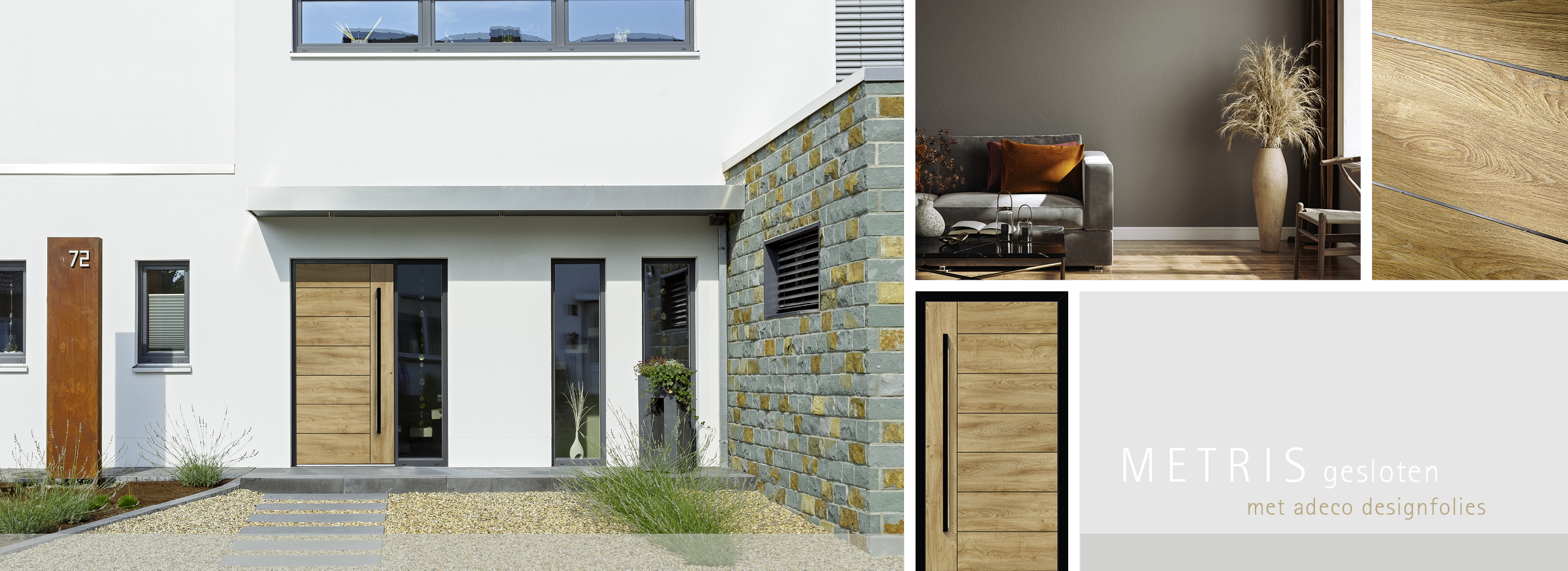 Houdt u van gezellig? Combineer dan zwarte details met een decor van natuurlijk hout. De adeco designfolies evenaren een houten uiterlijk en gevoel en geven de entree een uitnodigende, warme indruk. Kies uit vier huiselijke houttinten: malt, natuur, beton en alpine. Bij de modellen Metris beglaasd, Metris gesloten, Alliso en Caverro, is het mogelijk om de oriëntatie van de folie te combineren (adeco design foiling aD). Hierbij volgt de nerf het ontwerp van de deur, bijvoorbeeld het horizontale inlegwerk.
