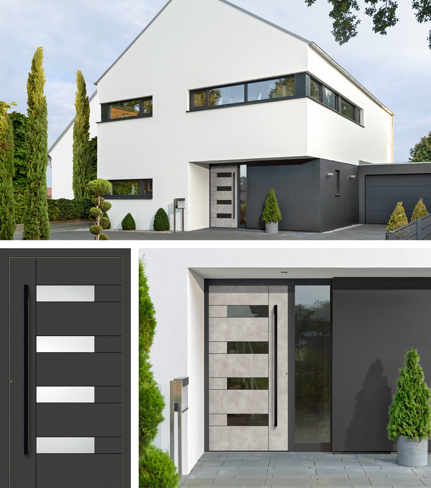 Schwarz als Gestaltungselement ist in der Möbelbranche schon länger im Trend. Aber auch Haustüren gibt die Farbe Schwarz einen neu entdeckten, ganz besonderen Eindruck. Sicher, eine weiße Tür passt zu fast allen Häusern, doch dunkle Töne verleihen mehr Tiefe und neue Gestaltungsmöglichkeiten. Wer es Ton in Ton mag, kombiniert zu den schwarzen Griffen und Applikationen auch den Briefkasten, die Hausnummer oder die Lampen in Schwarz. Und sogar die komplette Tür ist in Schwarz ein echter Hingucker. Haben Sie es gern modern, wählen Sie eine zeitlose Grundfarbe oder eine der trendigen  Designfolien in Rost- oder Betonoptik. Jedes einzelne Türmodell lässt sich so in reichlichen Kombinationsmöglichkeiten individuell gestalten und gibt Ihrem Haus seinen eigenen Charme.