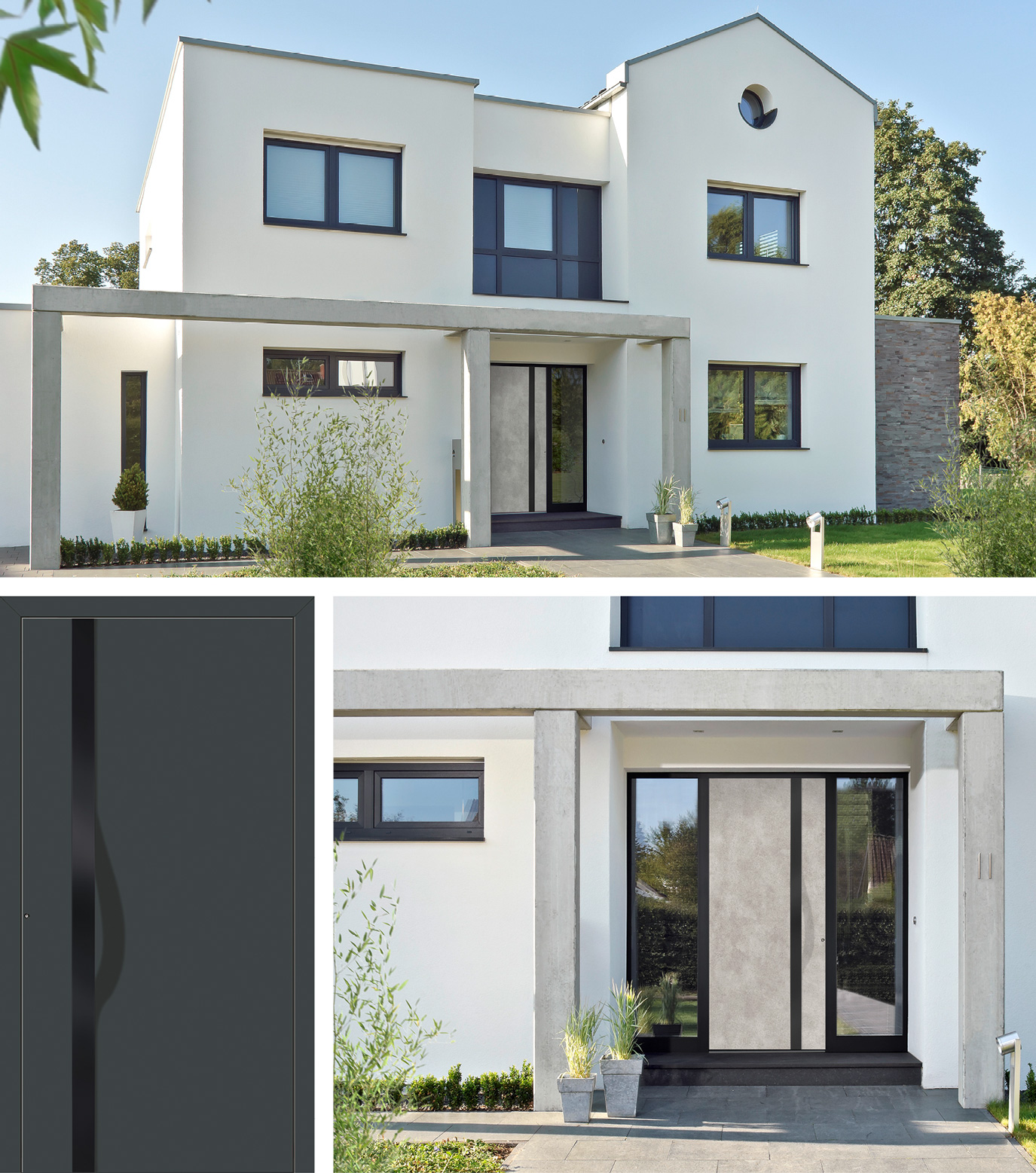 Schwarz als Gestaltungselement ist in der Möbelbranche schon länger im Trend. Aber auch Haustüren gibt die Farbe Schwarz einen neu entdeckten, ganz besonderen Eindruck. Sicher, eine weiße Tür passt zu fast allen Häusern, doch dunkle Töne verleihen mehr Tiefe und neue Gestaltungsmöglichkeiten. Wer es Ton in Ton mag, kombiniert zu den schwarzen Griffen und Applikationen auch den Briefkasten, die Hausnummer oder die Lampen in Schwarz. Und sogar die komplette Tür ist in Schwarz ein echter Hingucker. Haben Sie es gern modern, wählen Sie eine zeitlose Grundfarbe oder eine der trendigen  Designfolien in Rost- oder Betonoptik. Jedes einzelne Türmodell lässt sich so in reichlichen Kombinationsmöglichkeiten individuell gestalten und gibt Ihrem Haus seinen eigenen Charme.