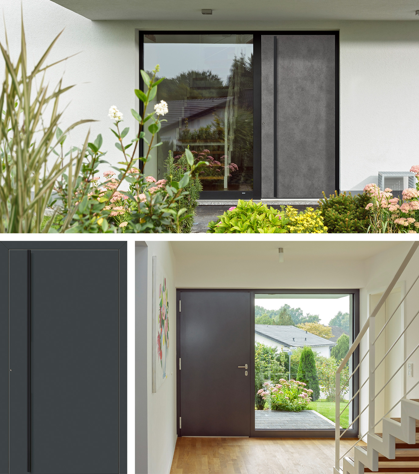Schwarz als Gestaltungselement ist in der Möbelbranche schon länger im Trend. Aber auch Haustüren gibt die Farbe Schwarz einen neu entdeckten, ganz besonderen Eindruck. Sicher, eine weiße Tür passt zu fast allen Häusern, doch dunkle Töne verleihen mehr Tiefe und neue Gestaltungsmöglichkeiten. Wer es Ton in Ton mag, kombiniert zu den schwarzen Griffen und Applikationen auch den Briefkasten, die Hausnummer oder die Lampen in Schwarz. Und sogar die komplette Tür ist in Schwarz ein echter Hingucker. Haben Sie es gern modern, wählen Sie eine zeitlose Grundfarbe oder eine der trendigen  Designfolien in Rost- oder Betonoptik. Jedes einzelne Türmodell lässt sich so in reichlichen Kombinationsmöglichkeiten individuell gestalten und gibt Ihrem Haus seinen eigenen Charme.