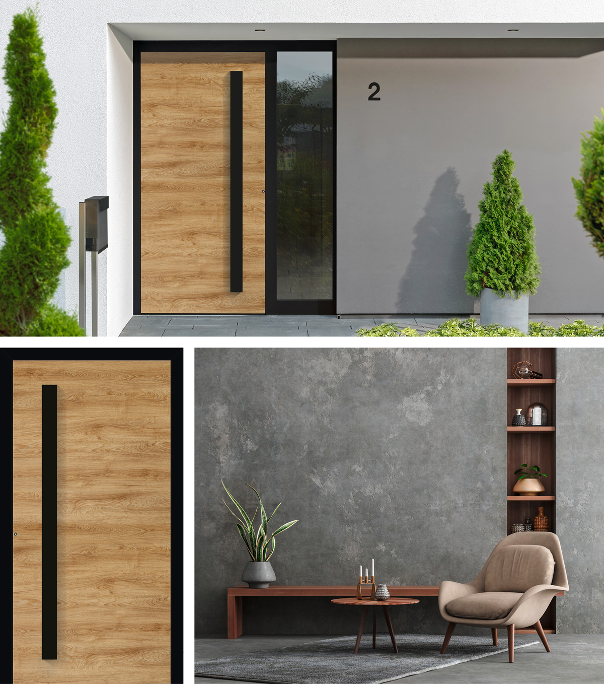 Mögen Sie es gemütlich? Dann kombinieren Sie schwarze Details mit einem natürlichen Holzdekor. Die adeco Designfolien ähneln echtem Holz in Optik und Haptik hervorragend, und verleihen dem Hauseingang einen einladenden Eindruck. Wählen Sie aus fünf wohnlichen Holzfarbtönen – malt, nature, concrete, alpin und amber. Bei den Modellen Metris verglast, Metris geschlossen, Alliso und Caverro ist es möglich, Längs- und Querfolierung zu kombinieren (adeco Designfolierung AD). Hier folgt die Maserung dem Design der Tür, beispielsweise den waagerechten Intarsien.