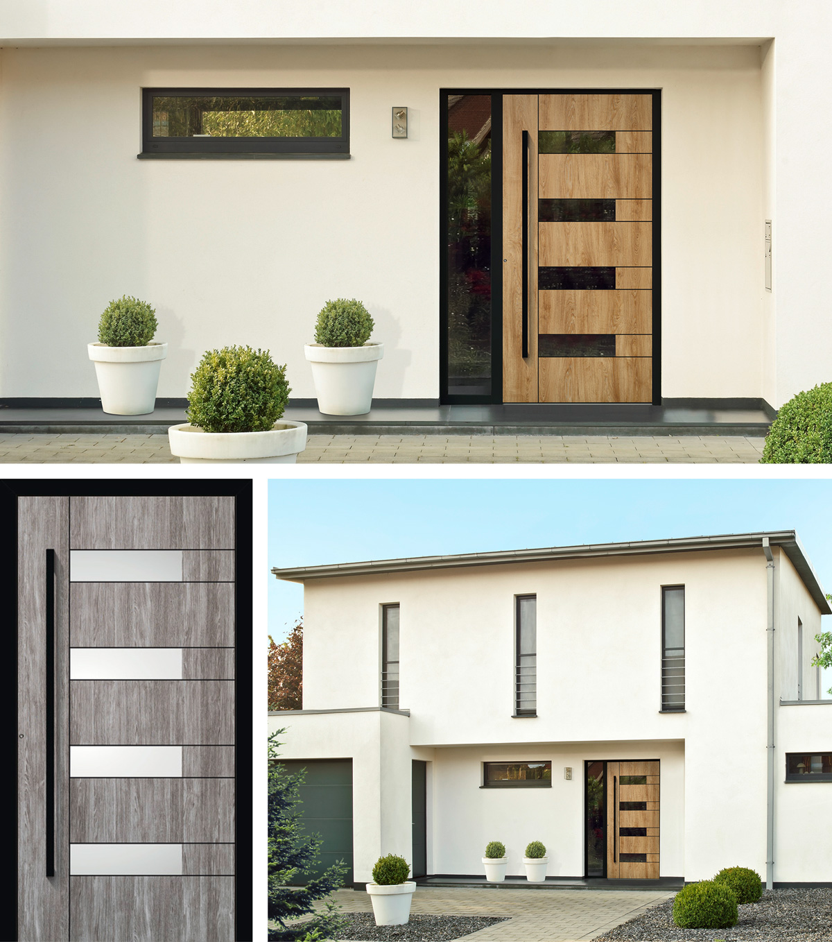 Mögen Sie es gemütlich? Dann kombinieren Sie schwarze Details mit einem natürlichen Holzdekor. Die adeco Designfolien ähneln echtem Holz in Optik und Haptik hervorragend, und verleihen dem Hauseingang einen einladenden Eindruck. Wählen Sie aus vier wohnlichen Holzfarbtönen – malt, nature, concrete und alpin.
