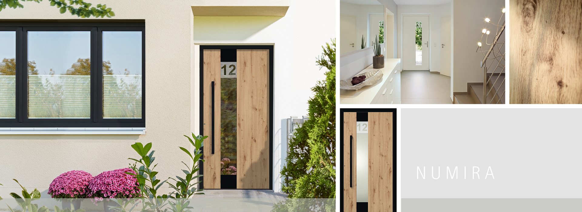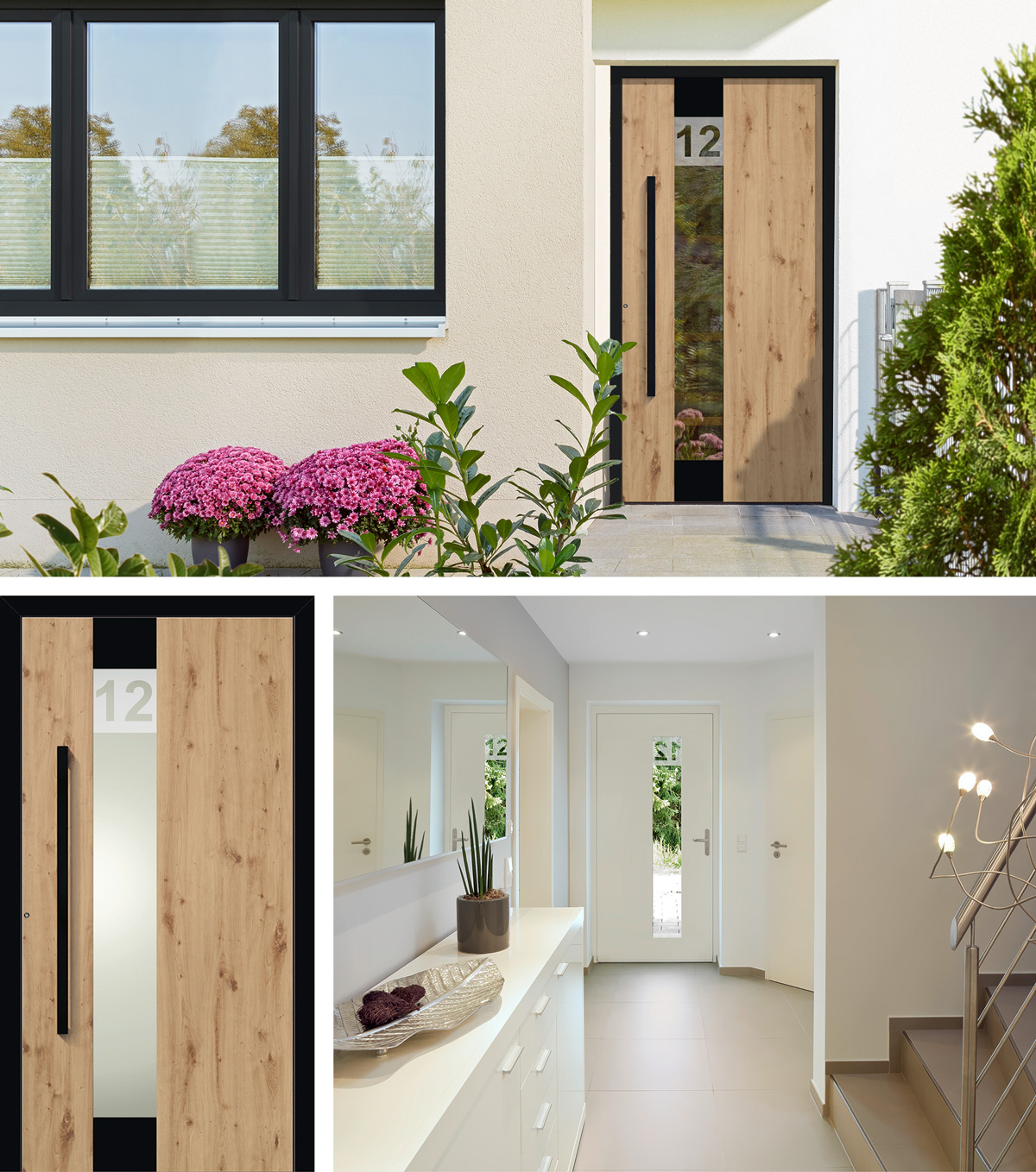 Mögen Sie es gemütlich? Dann kombinieren Sie schwarze Details mit einem natürlichen Holzdekor. Die adeco Designfolien ähneln echtem Holz in Optik und Haptik hervorragend, und verleihen dem Hauseingang einen einladenden Eindruck. Wählen Sie aus vier wohnlichen Holzfarbtönen – malt, nature, concrete und alpin.