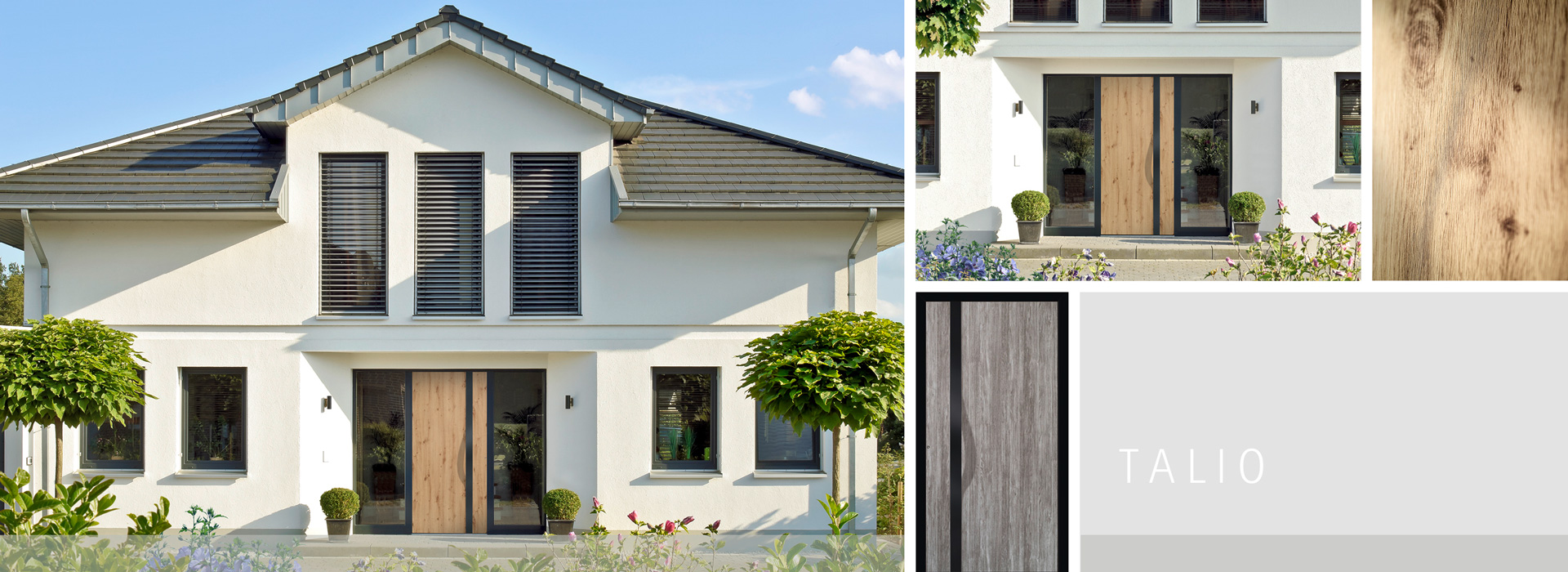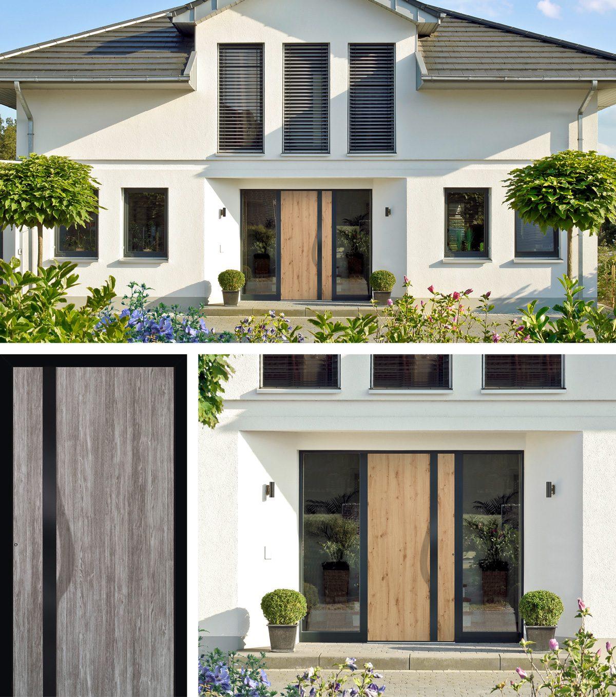 Mögen Sie es gemütlich? Dann kombinieren Sie schwarze Details mit einem natürlichen Holzdekor. Die adeco Designfolien ähneln echtem Holz in Optik und Haptik hervorragend, und verleihen dem Hauseingang einen einladenden Eindruck. Wählen Sie aus vier wohnlichen Holzfarbtönen – malt, nature, concrete und alpin.